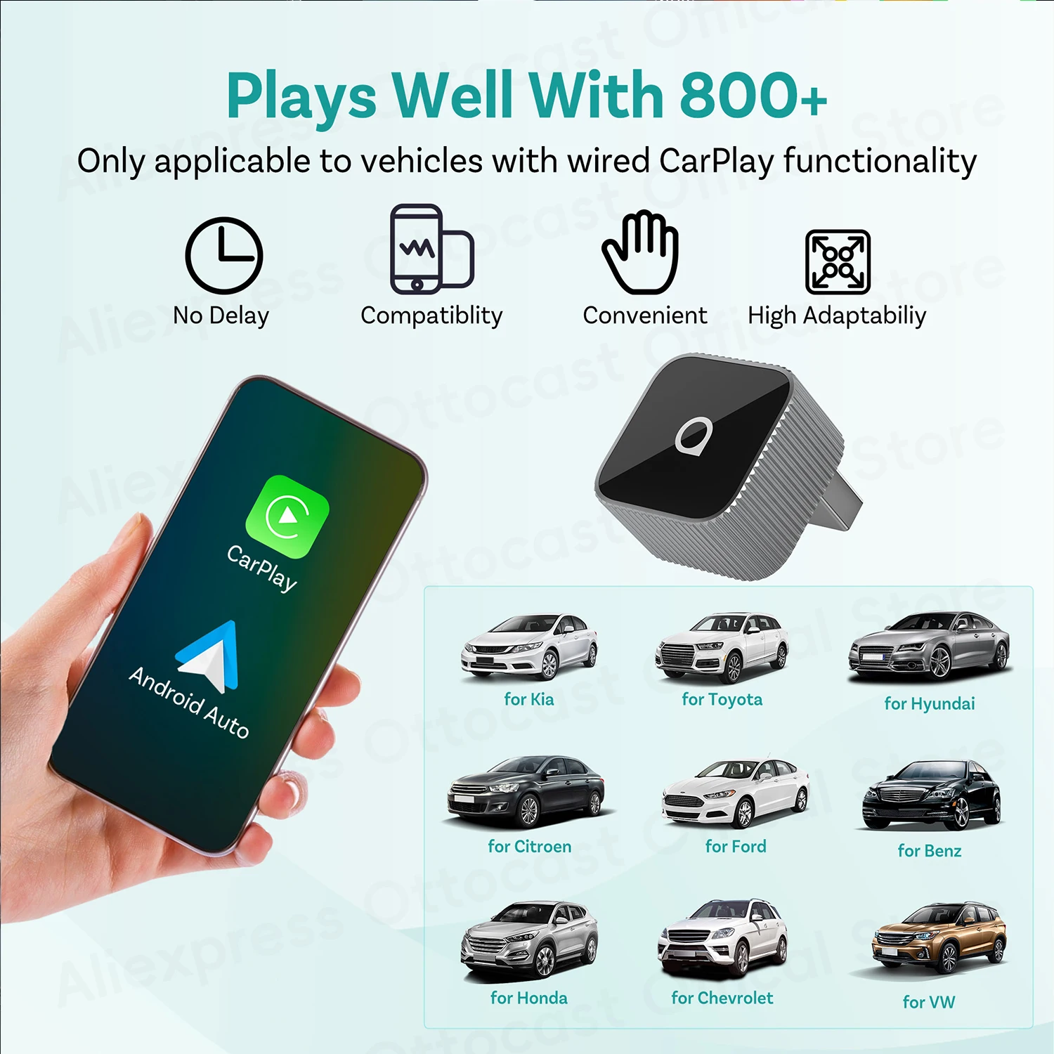 OTTOCAST Mini Slim Cube Wireless CarPlay Android Auto Adapter 2 in 1 USB AI Car Accessories for VW Haval Audi Kia Porsche Lexus